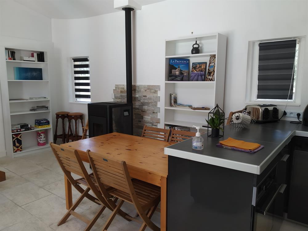 - Un séjour / cuisine (grande hauteur plafond) : cuisine moderne et fonctionnelle, table à manger, canapé, télévision TNT satellite.